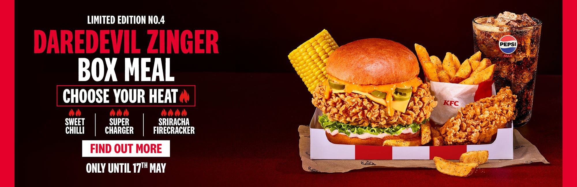 Ready to test your limits? The NEW Daredevil Burger range has landed, bringing a three-level full-on heat challenge designed to dial up the spice, choice, and talkability! Featuring our iconic spicy Zinger fillet, melted cheese, sliced jalapeños, crisp iceberg lettuce, and a new spicy habanero bun, the power is in your hands to choose your heat.